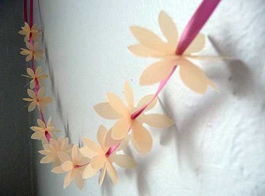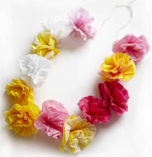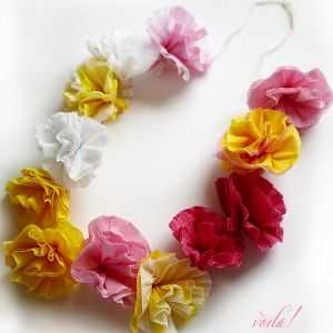 Интересные идеиВот еще один простой способ. Который заключается в том, что из отрезков гофрированной бумаги скручиваются цветы, а затем поочередно фиксируются на нити двойным узлом.