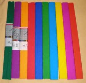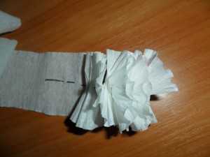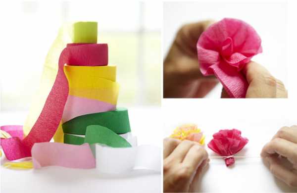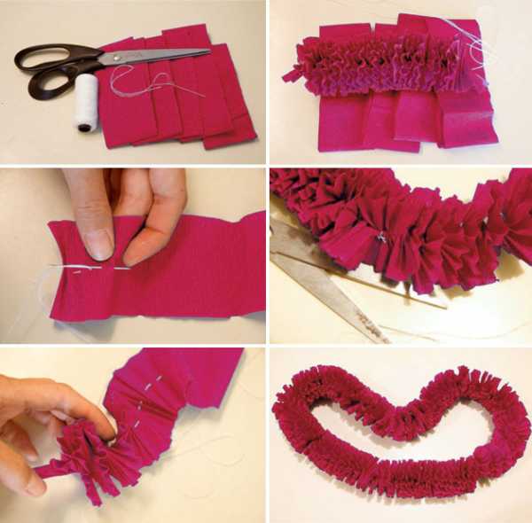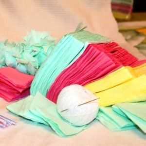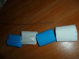 Для одной такой гирлянды приготовьте 1 рулон креповой бумаги. Рулон креповой бумаги надо будет в завернутом виде разрезать поперек на рулончики по 5 см. Затем каждый рулончик прошить нитками вдоль полоски, стягивая пучками. Когда пучок наберете на иголку, стягиваете его, а ту бумагу, которую стянули проворачивайте по часовой стрелке. Когда одна ленточка закончится, можно добавить ленточку другого цвета.