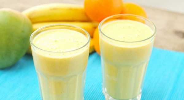 Например, берем 3 спелых банана, 2 зрелых манго, ложку меда, и 50 грамм яблочного сока. Все смешиваем в блендере и подаем в высоких стаканах.