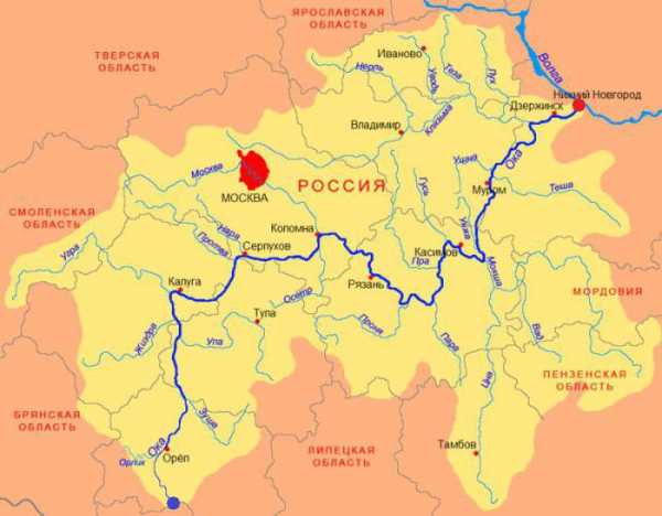 Притоки: Угра, Жиздра, Протва, Нара, Москва, Клязьма, Мокша и еще более сотни небольших притоков.