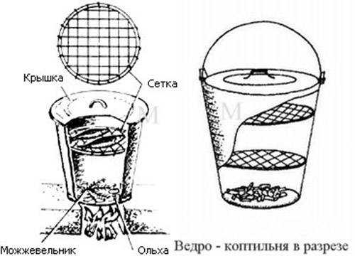 Коптильня для горячего копчения представляет собой железный ящик, без отверстий, с плотно закрывающейся крышкой, что необходимо для предотвращения попадания внутрь кислорода и горения опилок в процессе приготовления рыбы. Комплектуется поддоном — плоский железный лист — кладется непосредственно на опилки, предотвращает их горение и не допускает попадания на них капающего жира, и решетками, на которые непосредственно укладывается рыба.