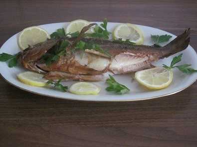 Готовность рыбы можно определить по золотистому цвету и сухости её поверхности. Мясо должно легко отделяться от костей на всей глубине тушки.