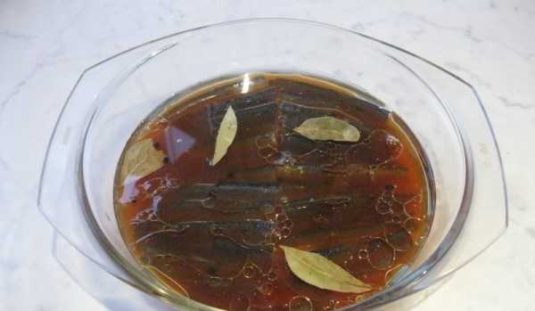 Эту довольно крупную рыбку нужно не только предварительно почистить, выпотрошить и отрезать головы, но и потомить немного в духовке. Выкладываем салаку плотно, спинками вверх. Томим при невысоких температурах. После этого рыбе нужно дать время настояться в собственном соку. Завариваем очень крепкий черный чай. Когда настой остынет, разбавляем его 100 мл растительного масла, добавляем специи и соль.