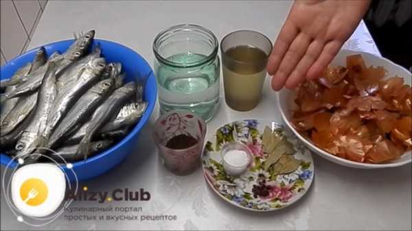 Затем процеживаем, а использованную шелуху выбрасываем. Параллельно завариваем очень крепкий чай (четыре пакетика на стакан кипятка), остужаем. Можно растворить в еще теплом чае большую ложку соли и маленькую сахара. Выпотрошенную рыбку без головы (салаку, мальков сельди, тюльку, хамсу) укладываем на противень или в огнеупорную форму очень плотно спинками вверх. Заливаем половиной стакана растительного масла.