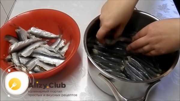 - В кастрюлю с толстым дном (вместо нее можно взять казанок) плотно сложите рыбу спинками кверху. Рыбешки должны быть прижатыми друг к другу.