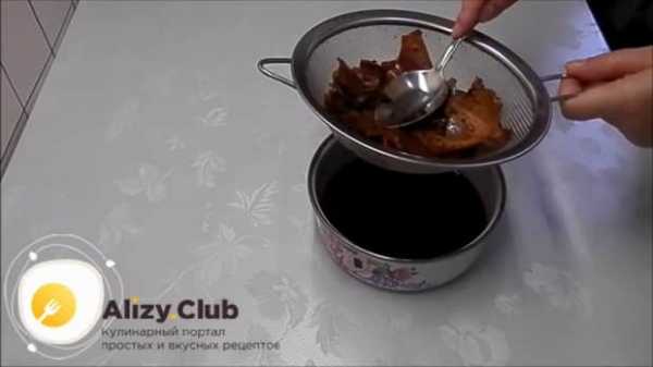- Когда маринад настоится, процедите его через сито. Отожмите луковую шелуху и чай – они могут впитать достаточно много влаги.