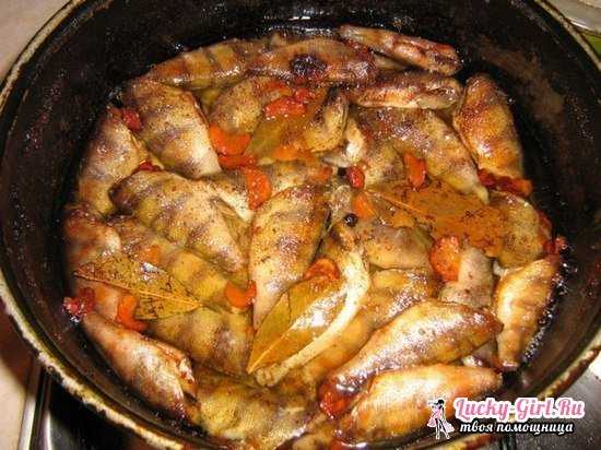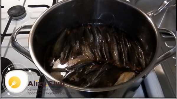 - Залейте подготовленную рыбу маринадом и 200-210 г растительного масла. Жидкость должна полностью покрывать тушки рыбки. В крайнем случае, можно добавить немного кипяченой воды. Поставьте кастрюлю с рыбой на плиту и доведите ее до кипения на среднем огне. Затем убавьте огонь до минимума и тушите рыбу под крышкой в течение двух часов.