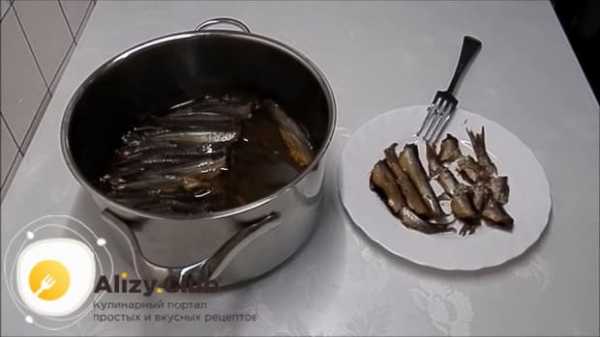 - Готовые шпроты должны остыть в кастрюле или казане – так он станут более упругими и не будут распадаться.