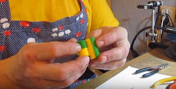 Далее, в отверстие одной заготовки продеваем, заранее приготовленную проволоку с тройником. Во вторую заготовку надо вставить трубочку от ушной палочки, излишки обрезать и оплавить аккуратно над свечкой её края.