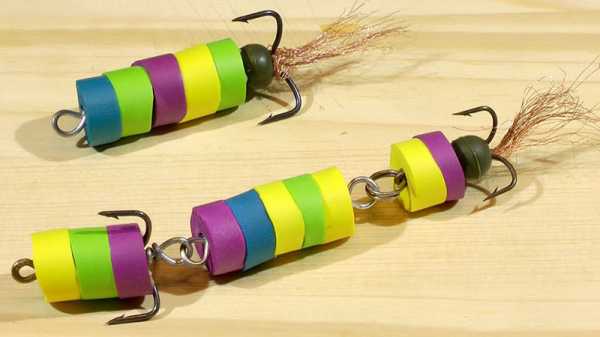 - Далее острыми полыми трубочками нужно вырезать шайбочки диаметром 1 см. Шайбы следует насадить на ось, в качестве которой служит основание ватной палочки. Между собой шайбочки склеиваются с помощью клея (лучше горячего). Часть, которая служит телом приманки, должна получиться длиной около 2−3 сантиметров и состоять из 2−3 шайбочек. Для изготовления хвостика используются шайбы более мелкого диаметра (примерно 0,7 см). Как правило, на изготовления хвостика требуется не больше 3 штук.