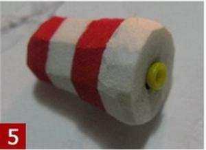 Теперь разделяем пенопластовые кружочки на две одинаковые части и соединяем клеем по следующему принципу: окрашенный – неокрашенный – окрашенный. В итоге у нас должно получиться два бочоночка с центральной белой серединкой.