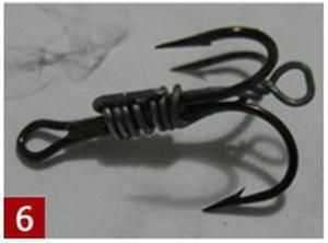 - Первый тройник, который располагается в голове приманки, оснащается проволокой таким образом, чтобы на нём располагалось 2 колечка. Переднее колечко при помощи пассатижей следует опустить так, чтобы оно располагалось чуть ниже цевья. Второе кольцо служит для скрепления головы с телом мандулы. В него же и вставляется кусок полой палочки, концы которой следует немного оплавить.
