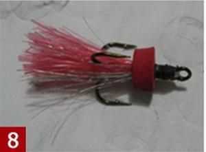 Берем еще один тройник и нашу красную шерсть (ее аналоговый заменитель). При помощи нитки и клея вяжем обыкновенную мушку. Пока клей еще не застыл, одеваем на крючок одну пластинку пенополиуритана круглой формы, чтобы придать положительную плавучесть.