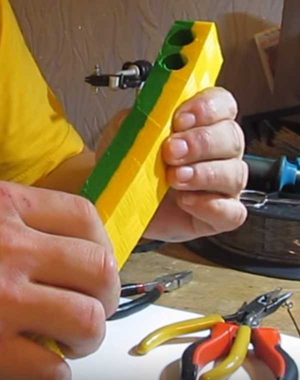 Далее необходимо зафиксировать каркас из проволоки на тройнике в одном положении. Ровно прикладываем заготовку к цевью тройника и приматываем ее тонкой нихромовой проволокой. После этого необходимо нанести небольшое количество водостойкого клея на место примотки: