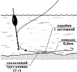 Для таких условий стоит пользоваться приспособлением с весом до 40 гр. Длина поводка 2м. Он находится на дне. Для быстрого погружения приманки, дробинки располагают вблизи подпаска.