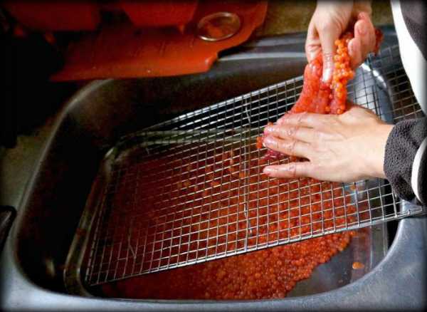 - Испорченные икринки убирают. Продукт снова промывают чистой водой.