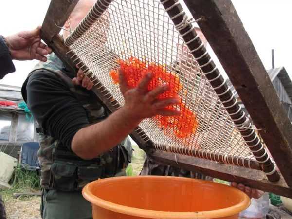 - Икра просто протирается через сито с нужными по диаметру отверстиями.