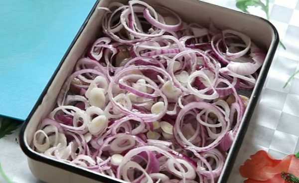 - Разделайте рыбу, поделите её на филе, натрите солью, и сложите в банку, чередуя каждый слой сельди слоем нарезанного кольцами лука.
