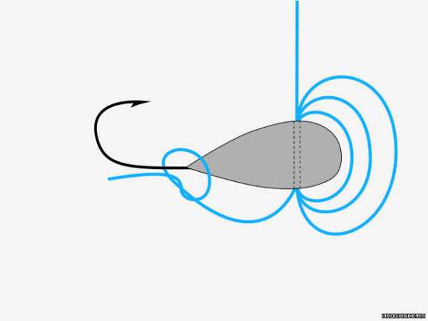 - Концом лески, в обратном направлении делается несколько витков вокруг цевья крючка и лески.