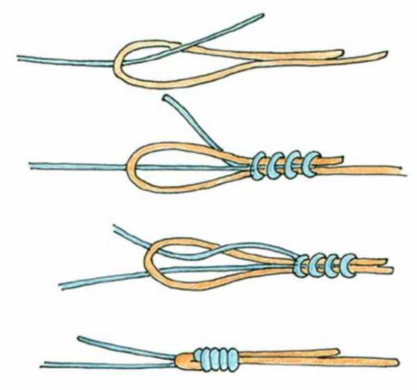 - Делают 4–5 оборотов вершины петли, из тонкой лески, вокруг толстой.
