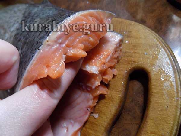 - Разделывать рыбу нужно немного примороженную. Полностью оттаянный лосось поддается разделке нелегко.