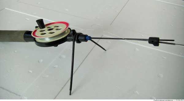 Держатель устройства выполнен из фанеры влагостойкого типа с наличием прорезей для снасти. Приспособления являются съёмными. Как только рыбная охота подходит к завершению можно без затруднений демонтировать держатель. В качестве креплений устройства выступают зажимные винты, позволяющие за считаные секунды производить установку и съем держателя.