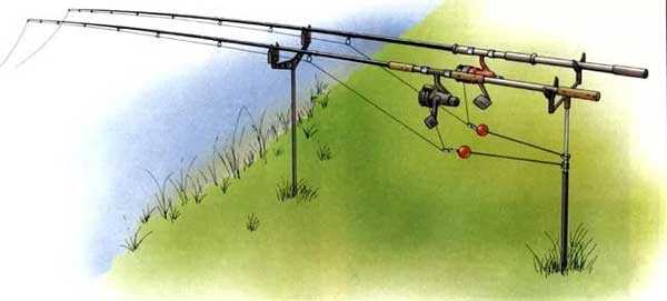 Отметим, что если стойка устанавливается на водоем со стоячей водой, то удилище будет располагаться параллельно береговой линии, а если это река с сильной скоростью течения, то верхняя сторона фидера будет расположена гораздо выше комли.