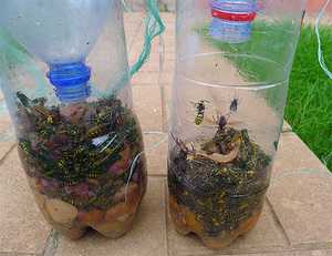 Самодельную ловушку для ос размещают часто на пасеке по периметру участка либо возле улья. Чтобы в западню не попались пчелы, наливают внутрь приманку, которая для них не представляет интереса. Пчелки равнодушны к браге, пиву, рыбе, мясу. Наливать сладости, соки, бросать кусочки фруктов не рекомендуется.