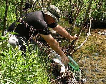 Но для опытного выживальщика пластиковый мусор имеет широкую область применения и вполне может спасти жизнь. Как вы можете видеть на картинке, я нашел пару пустых двух-литровых бутылок, которые, следуя вниз по течению, запутались в зарослях ольхи. В реальной ситуации выживания подобная находка на вес золота!