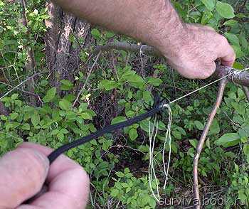 Ловушка для водоплавающихПомимо этого, есть более простой способ поимки водоплавающих, которые обитают у земли: понадобятся крепкие веревки, из которых нужно сделать самозатягивающиеся петли. Они закрепляются в открытом состоянии на длинной палке, установленной в горизонтальном положении над землей.