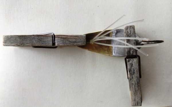 теперь подготовим наш уже полуфабрикат к приклеиванию усов, так как клей будет наносится с двух сторон, то следует позаботиться о том как блесна будет сохнуть, тут на помощь могут прийти обычные бельевые прищепки