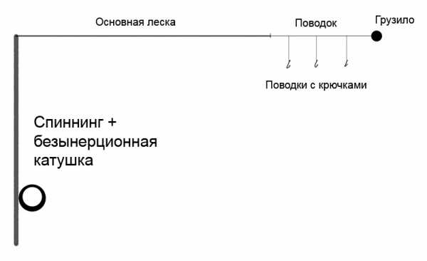 - на основную леску крепят груз на поводке с вертлюжком. Ограничителем служит резиновый демпфер. Поводки с крючками располагаются на конце лески. Подобным способом насадку можно приподнять над дном. После заброса для этого леску немного натягивают и затем фиксируют в этом положении. При поклеве рыба не чувствует сопротивления и смело глотает приманку.