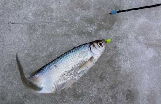 - Уклейка ловится не только летом, но и зимой. В теплые дни она хорошо клюет в пол воды и выше на мучное тесто, опарыша и мотыля.