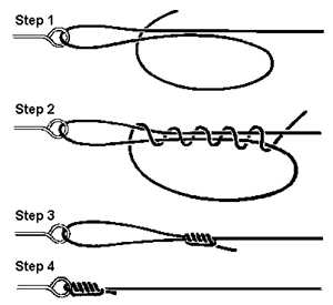 Чем больше витков, тем прочнее узел. Используется по большей части для тонких монолесок.