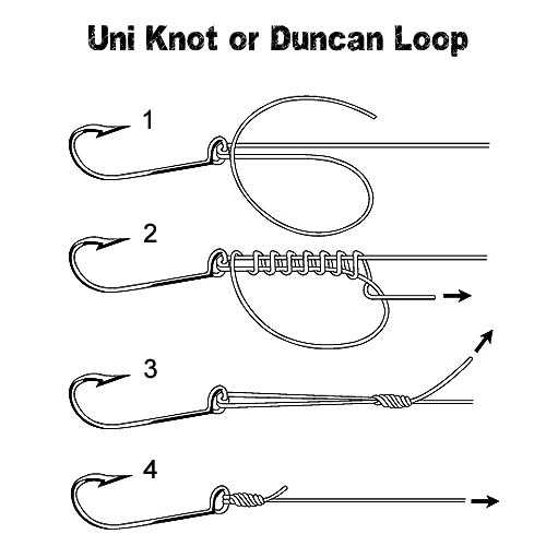 Петля Дункана (она же Duncan loop): вставляем свободный отрезок лесы в кольцо крючка. Обводим четыре — пять раз около вместе сложенного продолжения лесы и части конца. Предварительно смочив, затягиваем петельку.