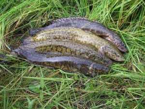 Поклевки налима в основном и бывают на эти крайние поводки с наживкой. Но бывает и так, что ловля налима происходит на середине реки, там, где сильное течение, при попытке ловить здесь донкой, её просто бы сносило течением. Поклёвки на перемёт посреди речки бывают только в полводы, так, как поводки с наживкой у дна уже не держатся – их приподнимает вверх. Проверять перемёт надо каждые полчаса, крючков то пять и вероятность поимки налима велика. Бывают поклёвки на одни и те же крючки – это значит, что сегодня это и есть налимья тропа.