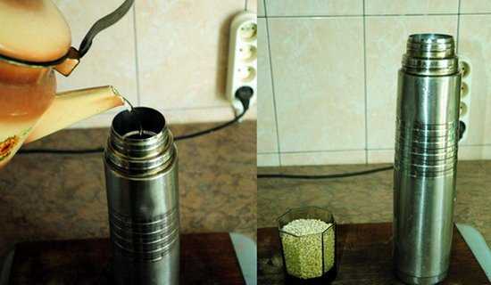 - Засыпать в термос и залить кипятком на 5 см выше уровня крупы.