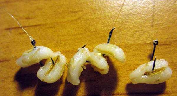 Правильно приготовленные зерна должны иметь относительно мягкую консистенцию и не слипаться между собой. Количество зерен, насаживаемых на крючок, зависит от его размера.