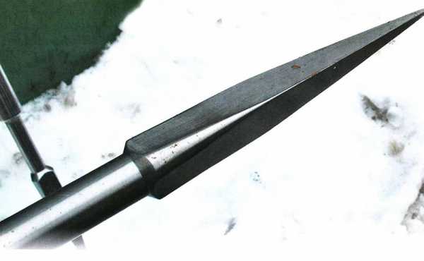 Для изготовления используется отбойный молоток. Наконечник выполняется в форме жала. От отбойнника отпиливают утолщенную часть, а наконечник сваркой крепится к трубе, имеющей необходимый диаметр. Трубу насаживают на деревянную часть. Лучше всего для изготовления деревянной части использовать клен, вяз, дуб, березу. Теперь нужно хорошо заточить лезвие. Заточка может быть трех- или четырехгранная, в виде долота или пики.