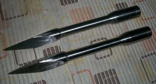 Что касается съемных ножей, то они могут быть выполнены по сложным схемам острого стержня, которые подразумевают фиксацию наконечника и ножей посредством болтов. В такой конфигурации рыболов может без особых сложностей менять форму и тип острия, увеличивая сферы применения своего инструмента.