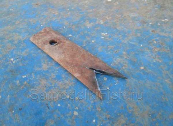 - Изготавливаем из рессоры острие трапециевидной формы. Широкое основание — 12 см, узкая часть имеет размер – 2 см, боковая часть с прямыми углами – 2 см.
