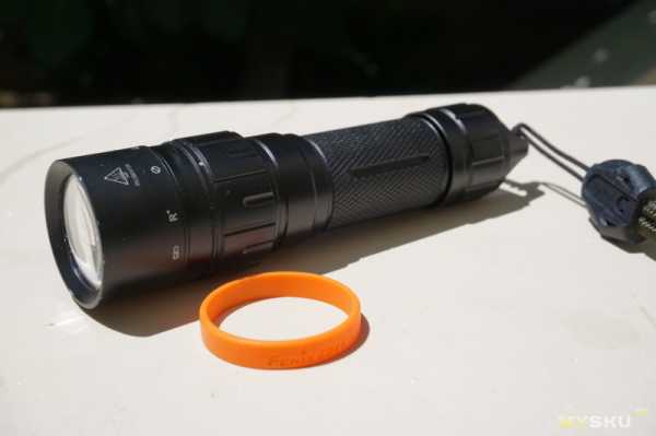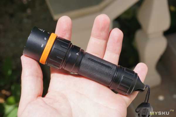 Тело фонаря покрыто ромбовидной накаткой с продольными выборками. На голове фонаря присутствует яркое силиконовое кольцо с логотипом: