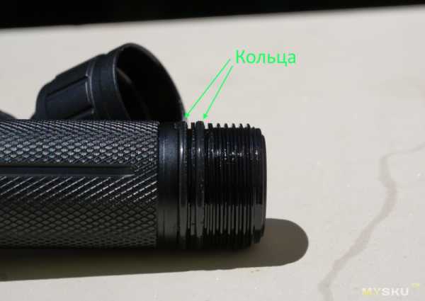 Голова не отворачивается, открутить можно только хвостовую крышку. Резьба глубокая, «трапецевидная», аккуратно смазанная. От попадания воды внутрь фонаря защищают два уплотнительных кольца.