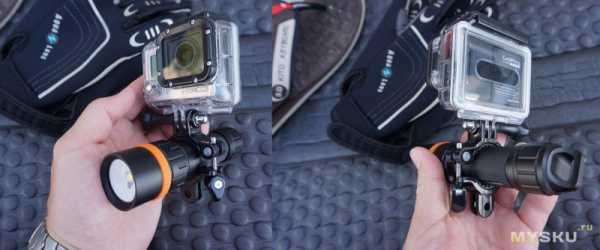 Сидит фонарь за счёт резиновых уплотнителей и струбцинки с мелкой резьбой очень плотно — покинуть крепеж у него шансов нет никаких. Всё готово — теперь можно удобно держать камеру под водой, держась за фонарь. При этому будет точно понятно, куда именно направлена камера. Это позволяет четче направлять объектив на предмет съемки, что обычно сделать затруднительно, так как экрана у камеры нет. Например так: