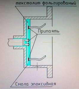 Берется кусок фольгированного текстолита (из которого платы делают). Медная фольга на нем режется пополам (+ и -). В центре 2 отверстия, через них припаивается залуженные концы кабеля. этот текстолит с припаянным кабелем торцом припаивается на дно крышки (на рисунке показан зазор залитый эпоксидкой, на самом деле его нет текстолит мажется эпоксидкой и плотно прижимается). далее (спустя 24час) чтобы кабель на «вошкался» заливаем и его (сзади). а также для подстраховки на дно крышки (на текстолит) льем около 5мм эпоксидки.