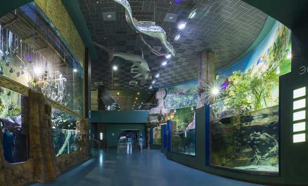 На первых двух этажах океанариума размещены морская и пресноводная экспозиции. В морской гости смогут увидеть акул, скатов, медуз, уникальных глубоководных рыб, обитателей коралловых рифов. В пресноводной экспозиции представлены речные обитатели – рыба из Волги, Нила, Амазонки, редчайшие разновидности речных аквариумных рыбок.