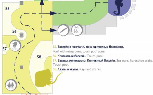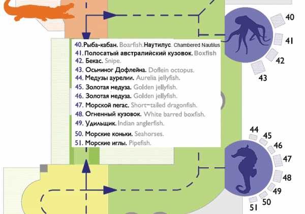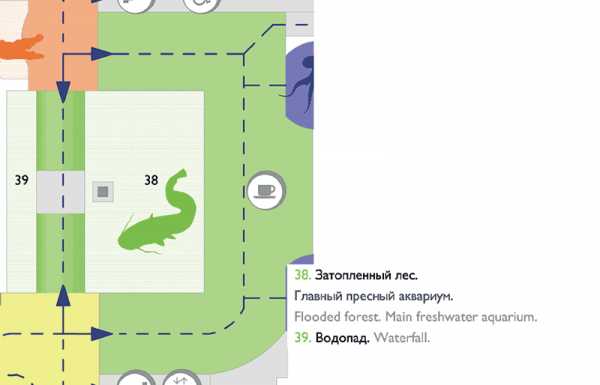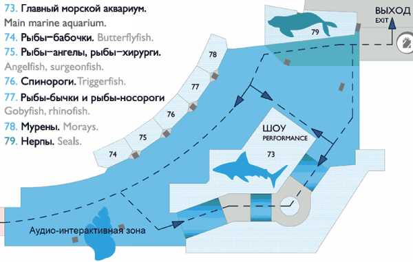 Помогать в путешествии по водоёмам планеты нам будет схема океанариума, вернее её части, соответствующие определённым экспозиционным комплексам.