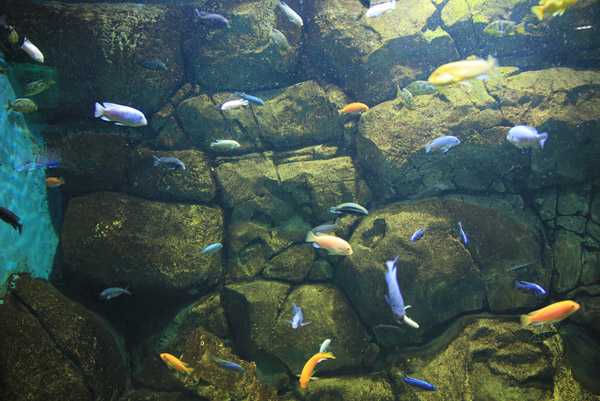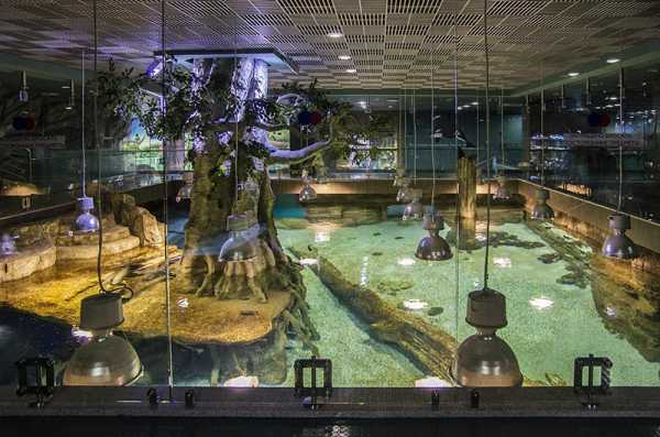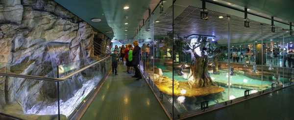 Сверху весь пресноводный аквариум как на ладони. От падения в воду надёжно защищают высокие стеклянные панели.