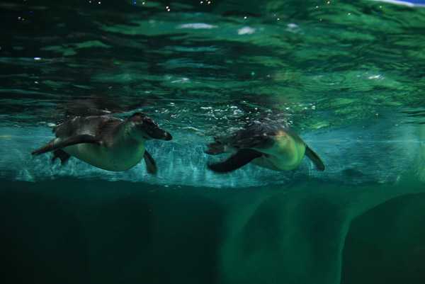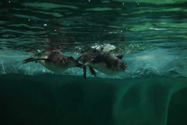 Первыми из обитателей океанариума посетителей встречают пингвины. Они обитают в таком бассейне.