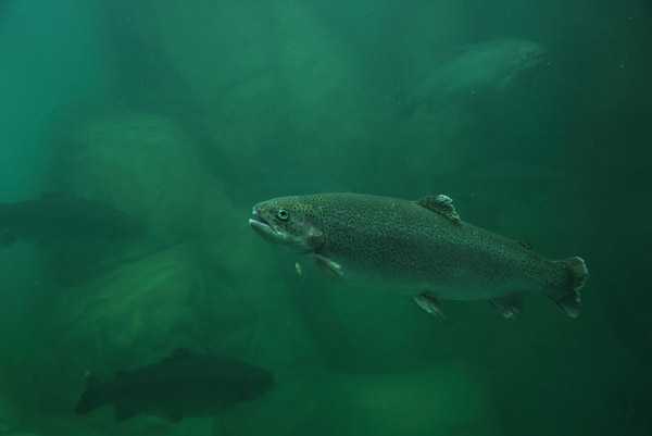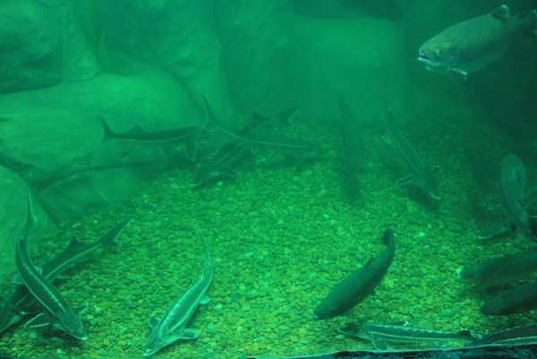 Этот аквариум чем-то напоминает осетровую ферму. Боюсь ошибиться, но всё-таки предположу, что это стерлядь и форель.
